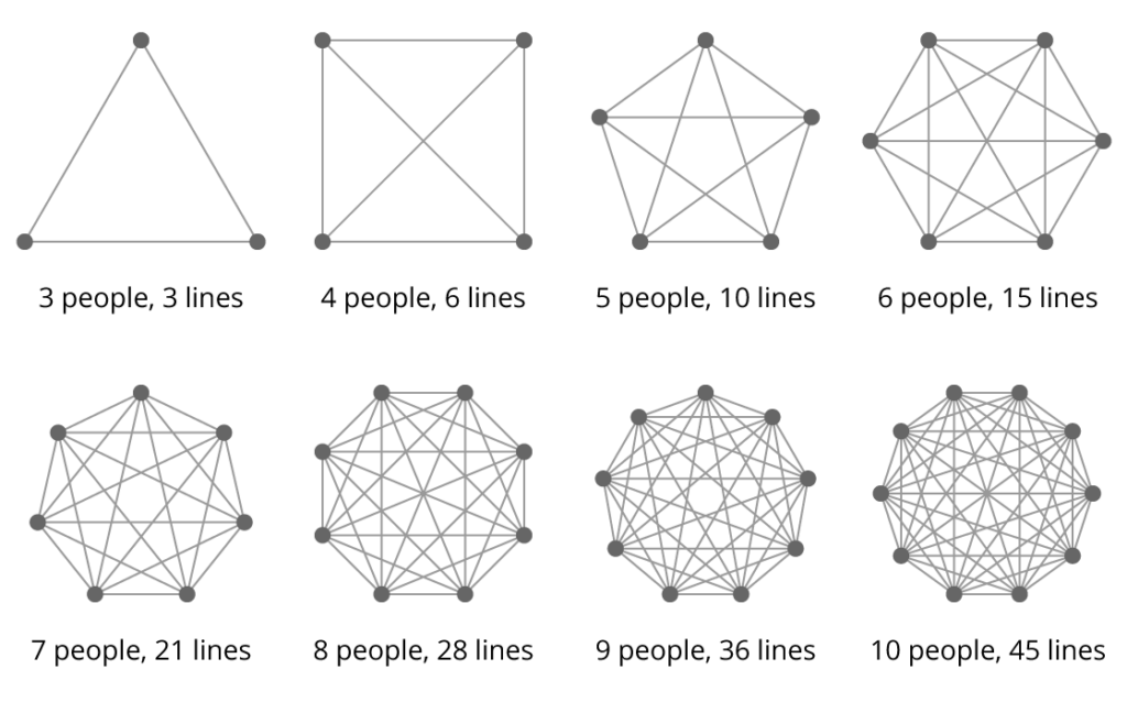 A growing team means we cannot talk to everyone everyday, just have a look at the picture below. With three or four people communication is easy. From five people up, things become more complex. We try to find a good balance between communication flow and getting things done.